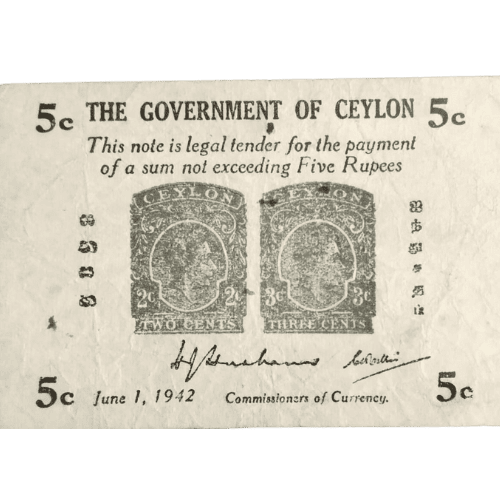 A World War II–era Ceylon 5 Rupees note issued in 1942, during British colonial rule. These early notes are admired for their vibrant colours, strong engraving, and low survival rate in collectible condition.