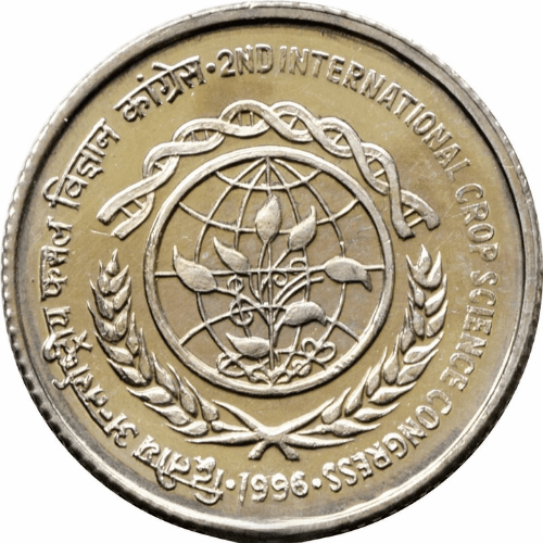 Minted in a nickel-brass alloy, the coin features a detailed emblem depicting elements of crop science, representing innovation in cultivation, food security, and scientific development. The reverse carries the iconic Ashoka Lion Capital and the denomination in the traditional Republic India style.
